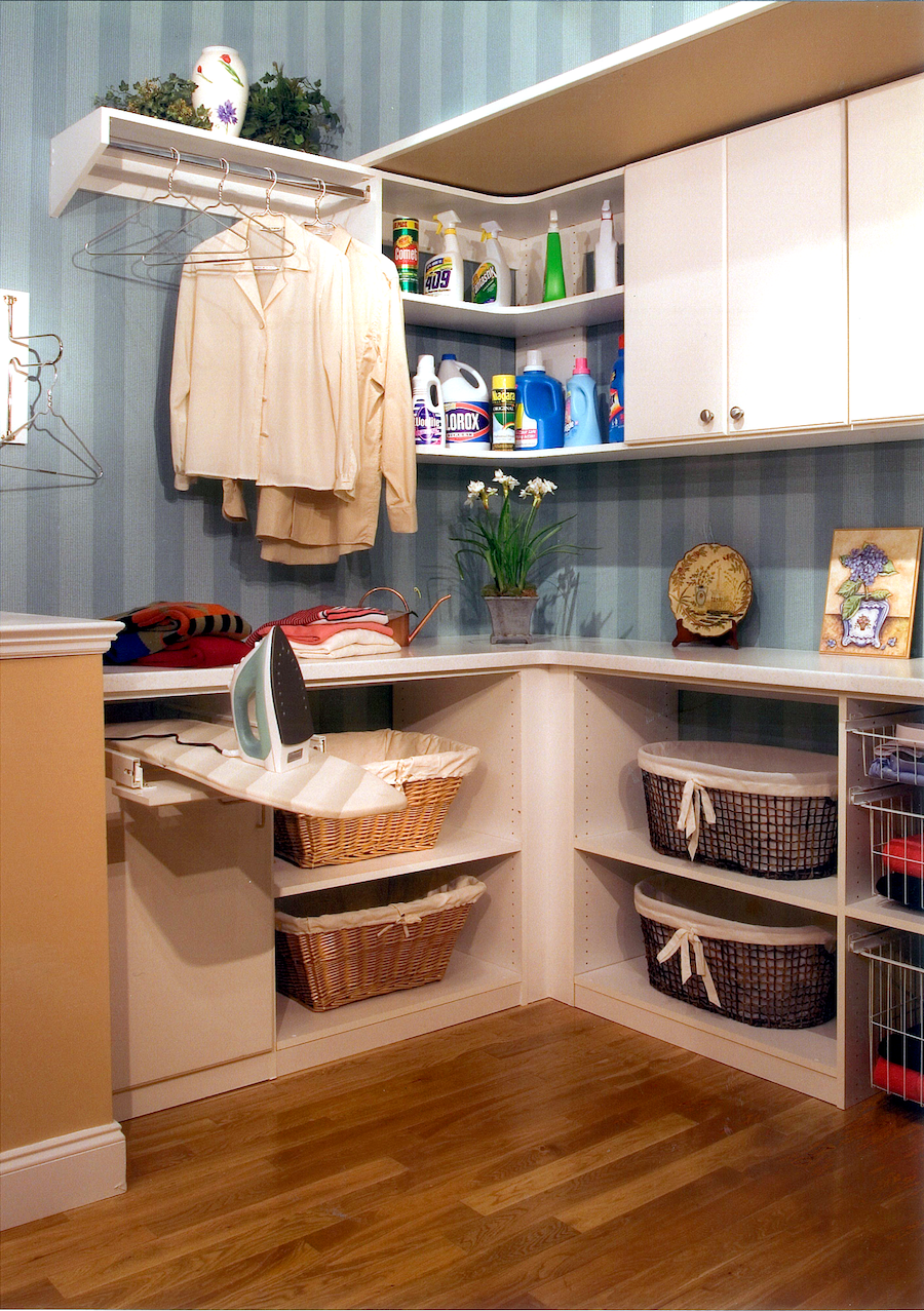 Adding a corner closet system with drawers to this type of setup allows you to hide small items, creating a sleek look that still maximizes every inch.